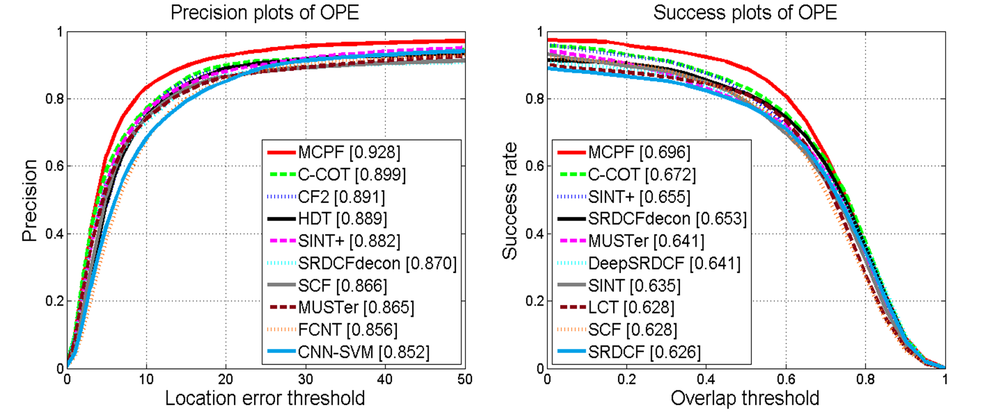 Figure 3. Precision and success plots over all 100 sequences using one-pass evaluation on the OTB-2015 dataset. The legend contains the area-under-the-curve score and the average distance precision score at 20 pixels for each tracker. Our MCPF method performs favorably against the state-of-the-art trackers. |