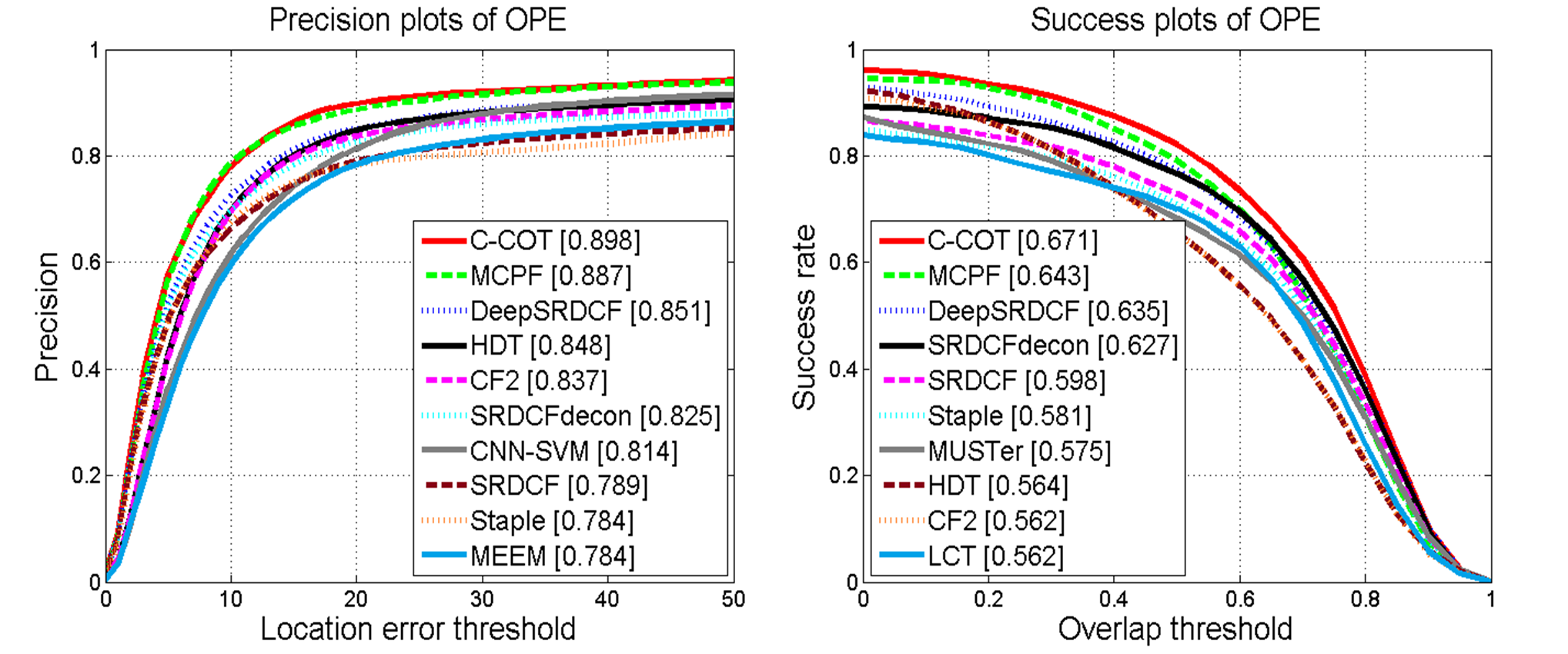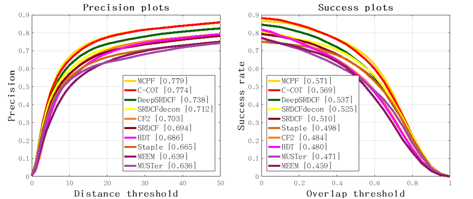 Figure 4. Precision and success plots over the 128 sequences using one-pass evaluation on the Temple Color dataset. The legend contains the area-under-the-curve score and the average distance precision score at 20 pixels for each tracker. Our MCPF method performs favorably against the state-of-the-art trackers. |