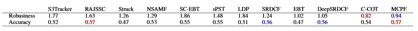 Figure 5. Comparison with the state-of-the-art tracking methods on the VOT2015 dataset. The results are presented in terms of robustness and accuracy. The proposed MCPF method performs favorably against the state-of-the-art trackers. |