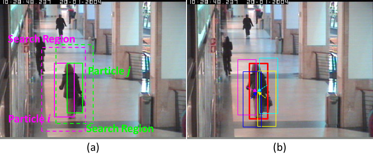 Figure 1. The proposed model is able to cover object state well with a few particles. (a) The model can cover object state well by using search regions of particles. (b) The model can shepherd particles toward the target object. |