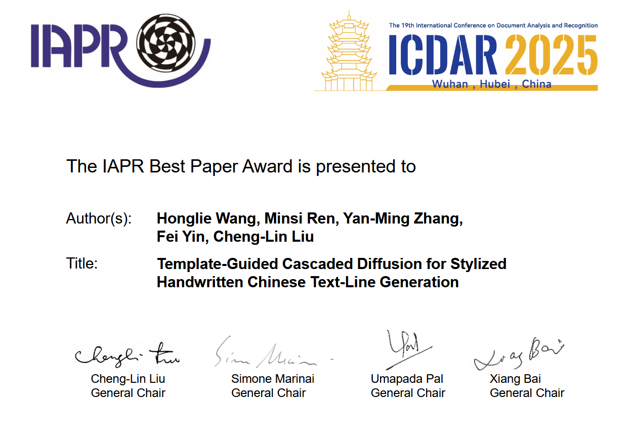 本组王鸿烈作为第一作者的文章 “Template-Guided Cascaded Diffusion for Stylized Handwritten Chinese Text-Line Generation”[1] 获得第19届国际文档分析与识别会议(ICDAR 2025, 9月16-21日,武汉)最佳论文奖。